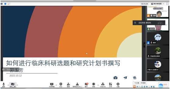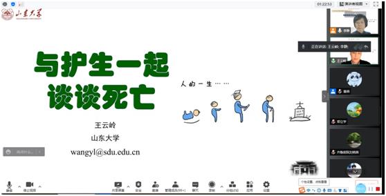 王云岭副教授的授课题目为《与护生一起谈谈死亡》,他从死亡的意义、超越死亡恐惧等方面,与护生们一起谈生论死,教育学生如何看待死亡,如何培养学生的人文关怀素养,逆向诠释了“大医精诚”“生命至上”的服务理念,引发了临床老师和学生们的深深共鸣。郭玉芳老师的授课题目为《如何进行临床科研选题与研究计划书撰写》,主要围绕着临床科研选题的原则,详细讲解了护理研究问题的选择、陈述与研究计划书的撰写,为2019级护理本科生的毕业论文(设计)和2021级的大学生科技创新提供了很好的学习思路,使大家受益匪浅。
