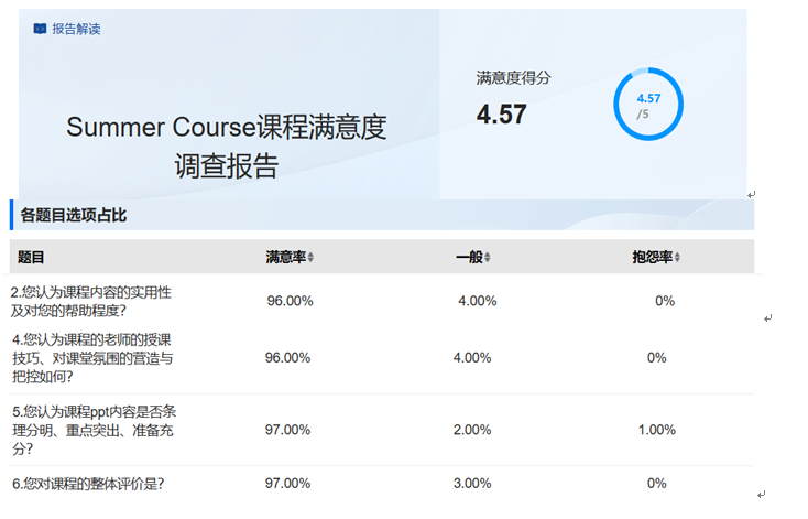 本课程深受学生的欢迎,每节课的出勤率高于89%。同学们对课程留下的作业也按时完成并发送到了指定邮箱。课程结束后,齐美苓副研究员通过网上调查问卷的形式针对课程内容实用性、课程内容掌握的难易度、授课教师授课技巧、对课堂氛围的营造与把控、ppt内容条理性等做了进一步的满意度调查。本次调查共有129名学生完成问卷填写,学生的整体评价分数高达4.57/5分,对课程整体满意度为97%,其中对课程内容实用性、授课老师授课技巧、ppt内容条理性的满意度分别为96%,96%和97%。同学们很好的理解了健康专业和哲学层面研究的概念,掌握了科研设计要素和研究过程。