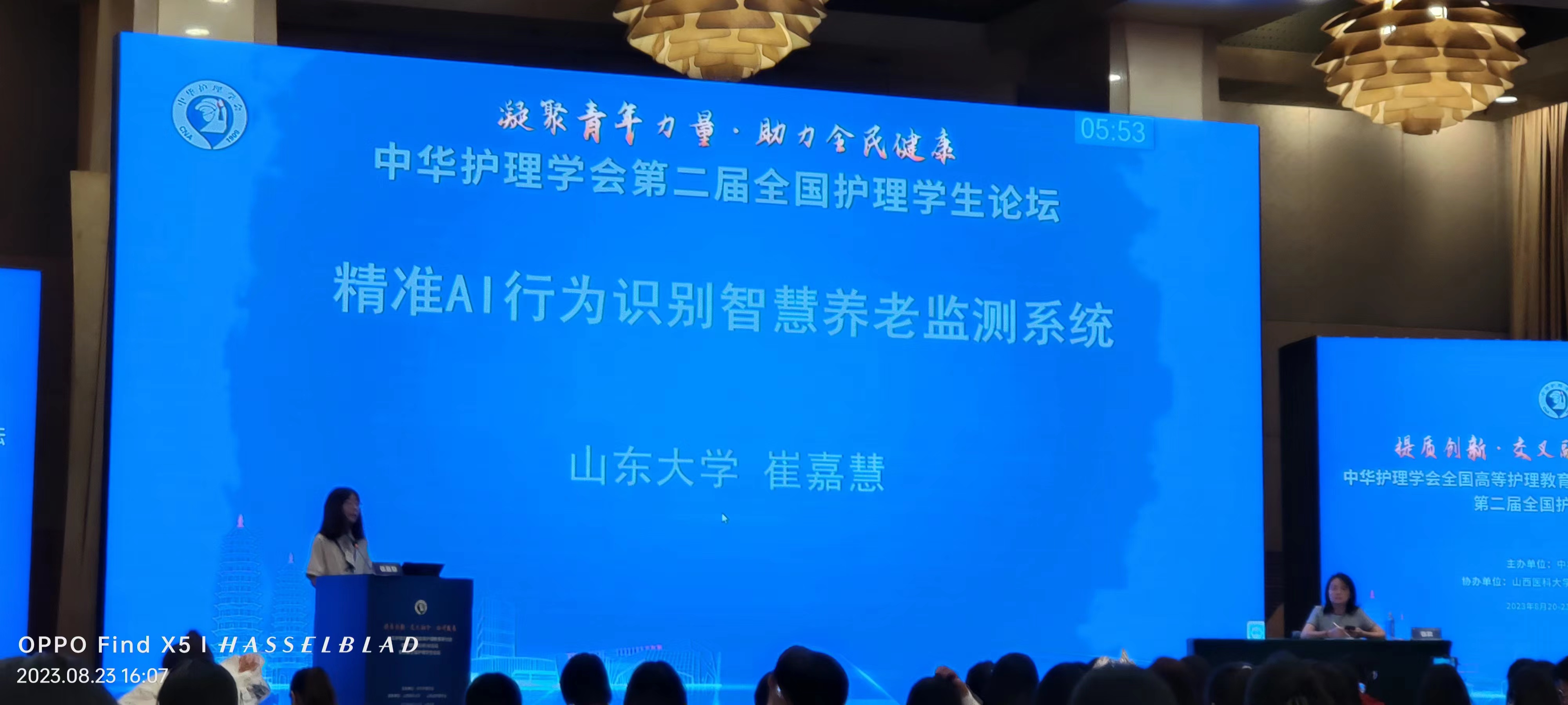8月23日下午,学生创新创业论坛在大宴会厅举办。来自21级护理四年制班的崔嘉慧同学与大家分享了《AI护长者——精准AI行为识别智慧养老监测系统》项目的研究历程。在大会发言过程中,崔嘉慧同学与大家分享了自己的创新创业心得,并积极与其他学校的同学交流互动,认真回答观众提问,在沟通交流中共同促进护理学本科生创新创业教育发展。谈及崔嘉慧同学对此次大会发言的感受,她提到:“纸上得来终觉浅”,护理学作为一门兼具实践性与科学性的学科,需要我们本科生勇于创新、敢于实践,努力将书本所学知识转化为实际成果,在实践中巩固,在交流中发展。