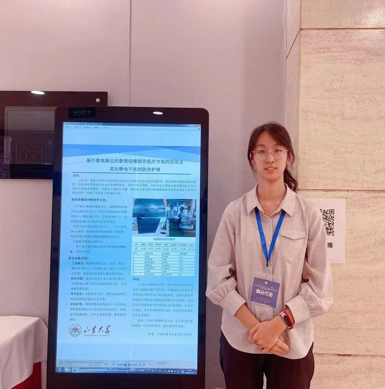 在场外,还设有电子壁报的展示。来自21级护理管理创新实验班的刘倩伊同学所投稿的《基于湿电除尘的新型硅橡胶在医疗方面的应用及其对静电干扰的防治护理》被录用其中。在壁报交流的过程中,刘倩伊同学积极与会场外的同学沟通,并从中获得启发。问及刘倩伊同学对此次壁报交流的感受,她提到:自己先前一直认为学术研究是一场独行,是一个人的钻研苦练,而同行者的话语让她意识到,科研从来不是孤独的苦海,而是灵感的碰撞。