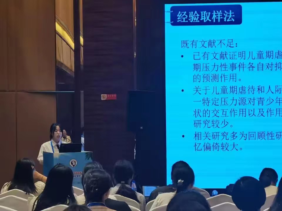 11月4日,会议在海南国际会展中心多功能厅举行。来自20级护理管理创新实验班的庄美婷与大家分享了《儿童期虐待与近期人际压力对青少年抑郁症状的交互作用——对累积压力假说和匹配不匹配假说》的研究。谈及庄美婷同学对此次大会发言的感受,她提到:科研不仅需要自我思考,也需要和同行者的讨论交流和互相学习。科研路上纵然困难重重,但只要我们认准方向,坚持努力不放弃,不断学习、寻找解决办法,时间自会有答案。