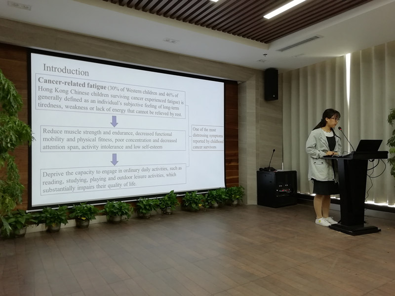 第二位汇报者是2017级学术型硕士研究生白晨晓,汇报的文献题目为“Adventure-based training to promote physical activity and reduce fatigue among childhood cancer survivors: A randomized controlled trial”,是2018年发表在“International Journal of Nursing Studies”杂志的一篇随机对照试验研究。癌因性疲乏是癌症患儿报告的最痛的症状之一。尽管有证据证实常规体力活动可以降低癌因性疲乏,但是在癌症患儿中还是经常出现缺乏体力活动的情况。本研究目的在于检验基于冒险的训练在提高香港中国癌症患儿体力活动、降低疲乏、增加自我效能和生活质量的效果。研究对象来自于儿科肿瘤门诊、儿童癌症中心以及阳光组织,年龄在9-16岁,曾报告疲乏症状,并且在过去的6个月内没有参加常规性的体力活动。研究中实验小组进行了为期4天的基于冒险的训练计划。对照组接受了安慰剂的干预。主要结局是随访12个月时的疲劳程度。次要结局是随访12个月的身体活动水平、自我效能和生活质量。数据是在基线、干预开始后的6个月和12个月进行收集的。并进行了意向性治疗分析。本研究从2014年1月6日-2015年6月8日收集了222名癌症患儿,随机分配到实验组117名,对照组105名。与对照组相比,在随访第12个月时,实验组显示更低的癌因性疲乏(P<0.001),更高的自我效能(P<0.001)和体力活动水平(P<0.001),以及更好的生活质量(P<0.001)。这项研究证明基于冒险的训练对促进香港中国癌症患儿体力活动、减少癌因性疲乏、提高的自我效能和生活质量是有效的。这些结果可能有助于告知家长和卫生保健专业人员,定期的体育锻炼对儿童癌症幸存者的身心健康和生活质量至关重要。