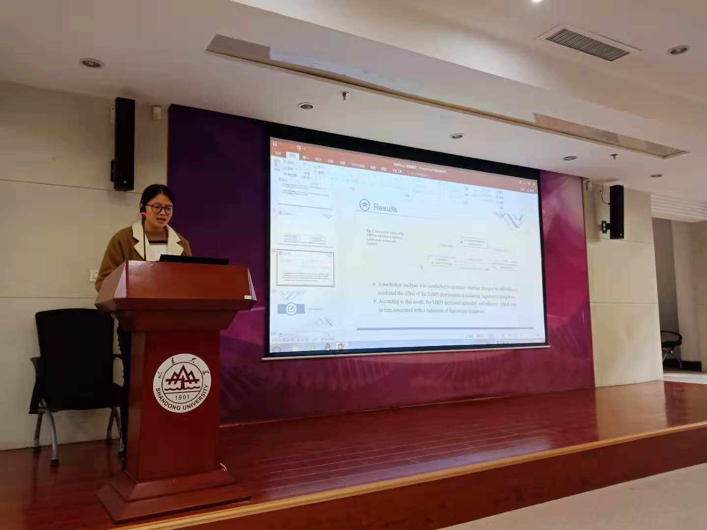 第三位汇报者是2017级学术型研究生徐晓芳,她本次汇报的文献题目为“How Does the Mindfulness-Based Program for Infertility (MBPI) Work in Reducing Depressive Symptoms?”,即:不孕不育的正念干预是如何降低抑郁症状的?该研究提出了针对不孕不育人群的正念干预,目的是探讨进行不孕不育正念干预的女性抑郁症状的降低是否会受到其不孕不育自我效能升高的影响。其将是否干预(干预:0;没有干预:1)作为自变量,干预后的自我效能作为中介变量,干预后的抑郁症状作为结局变量,干预前的自我效能和抑郁症状作为协变量纳入方程。结果发现不孕不育正念干预可以通过增加个体的自我效能来降低抑郁症状。