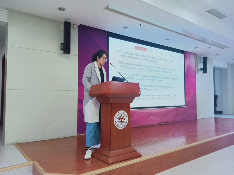本次论坛的第一位汇报者是2017级专硕型研究生徐奇,她汇报的题目是“Factors Influence the Acceptance of Surgical Treatment in Chinese Bariatric Surgery Candidates”。该研究的目的是探索影响中国人接受减重手术的影响因素。中国作为第一肥胖人口国家,大众对减重手术的了解却是少之又少,接受度也相应一直处于低迷期。最终该文章发现体重,BMI,家庭支持,有医疗保险以及自身合并并发症,过去做过手术和家人患有二型糖尿病的因素影响肥胖人群接受减重手术。