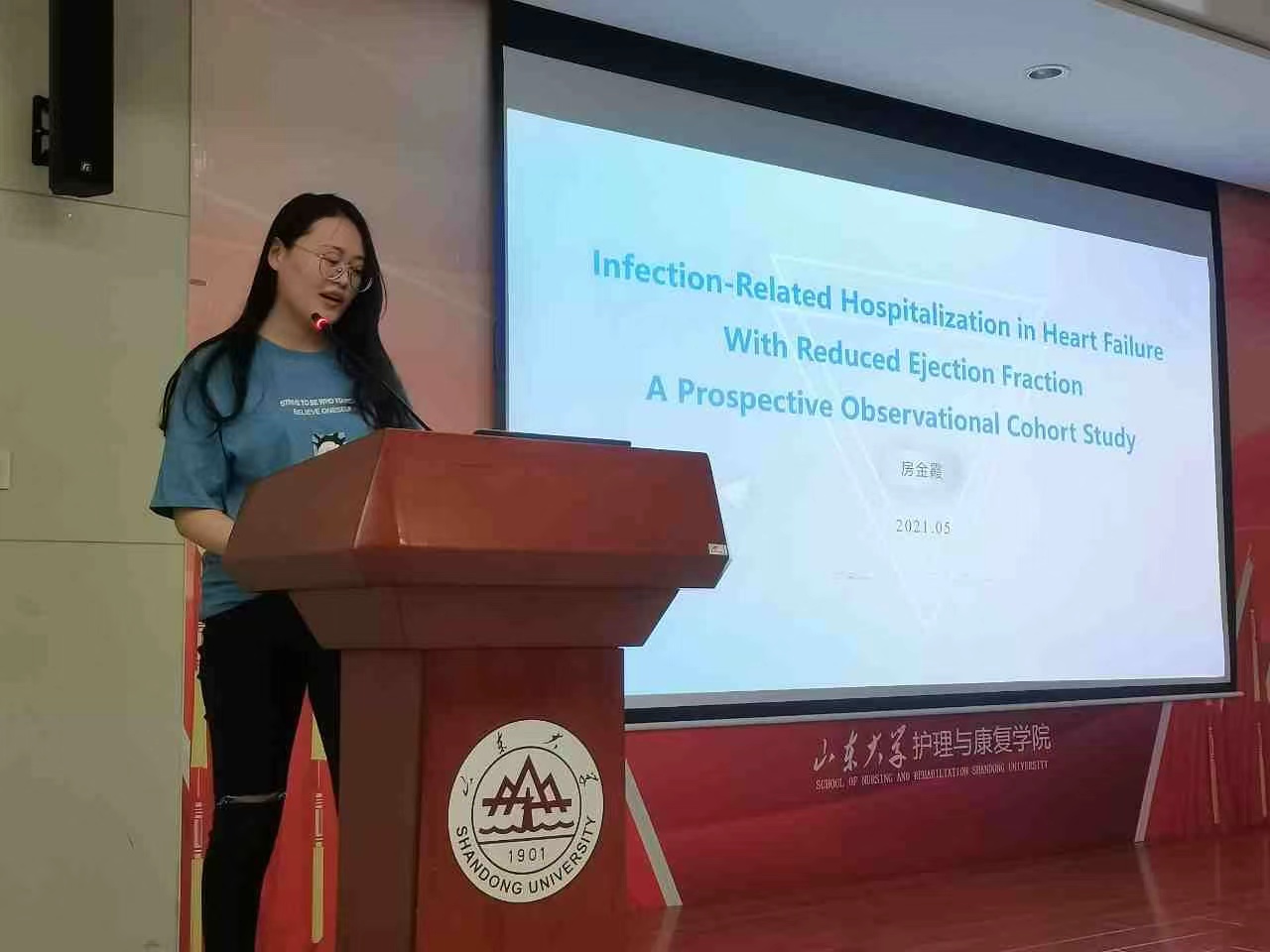 第二位汇报者为2019级专业型硕士房金霞,分享的是于2020年5月Michael Drozd发表于Circulation: Heart Failure的一篇文章,文章题名为《nfection-Related Hospitalization in Heart Failure With Reduced Ejection Fraction——A Prospective Observational Cohort Study》。射血分数降低的心衰患者生存率的提高伴随着死亡模式的显著改变,并且,非心血管原因变得越来越重要。而感染时心力衰竭患者住院的主要原因之一,但其预后影响尚不明确,因此这篇文章的主要目的是探究感染相关的住院之后所带来的预后影响和生存率的改变。本文的研究结果表明:感染是射血分数降低的心衰患者住院治疗的主要原因,但可能难以识别且没有典型体征。并且,感染相关住院治疗与失代偿性心力衰竭住院治疗后的短期和长期死亡率一样高,其持续负担也高于其他类型的住院治疗。这表明,预防、识别和治疗感染的新方法可以大幅度地改善射血分数降低心衰患者的结局。