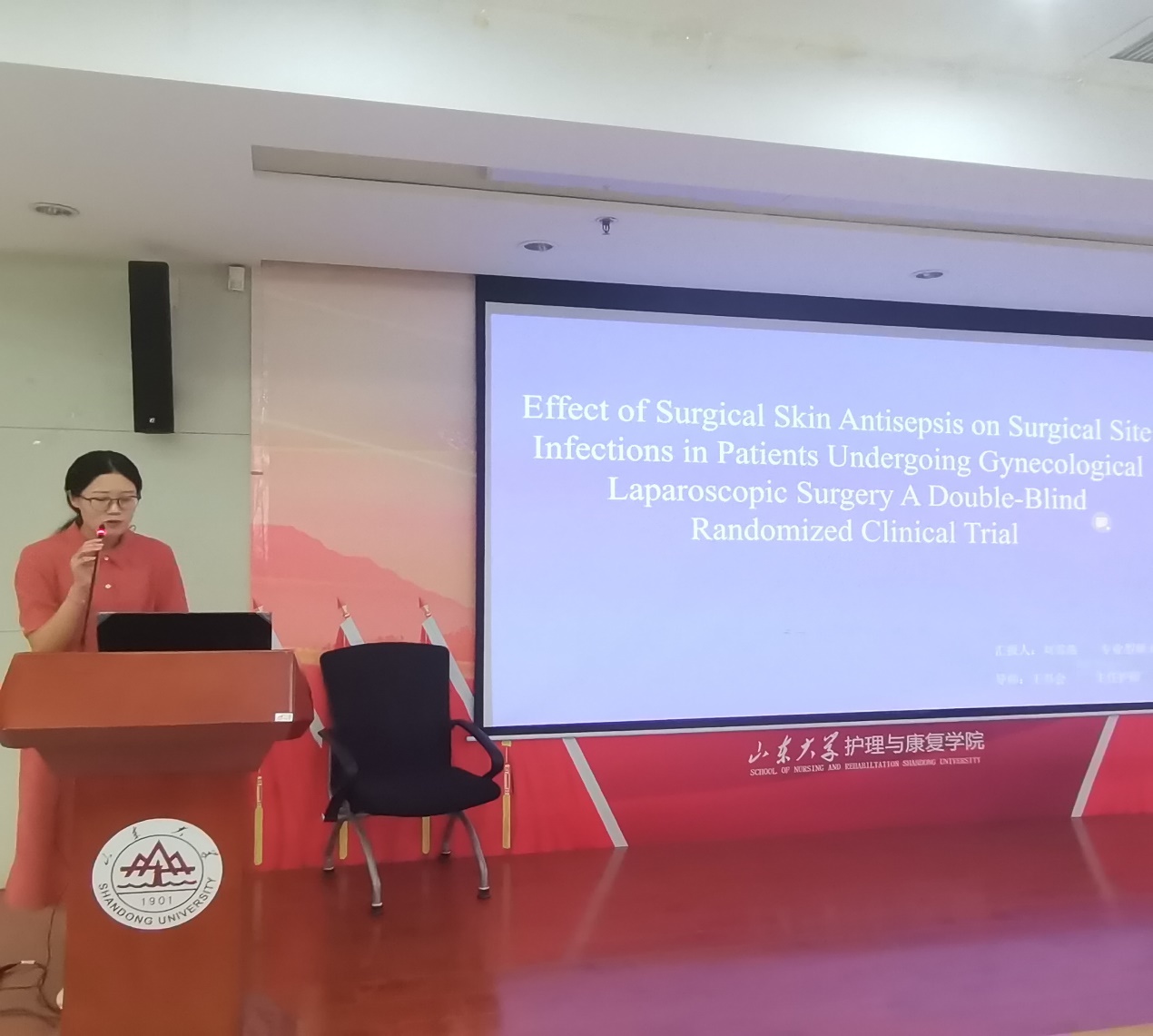 第三位汇报者刘雪燕的汇报题目是《Effect of Surgical Skin Antisepsis on Surgical Site Infections in Patients Undergoing Gynecological Laparoscopic Surgery A Double-Blind Randomized Clinical Trial》。妇科腹腔镜是世界上最常见的外科手术之一,而目前有关于预防妇科腹腔镜术后感染的研究较少。本研究的目的是比较接受3种不同皮肤准备液患者妇科腹腔镜手术患者的浅部组织感染、器官或腔隙感染以及任何类型的手术部位感染的发生率。本研究是是一项双盲随机临床试验,是在2017年2月28日至2018年11月26日,一所高等学校附属医院进行。共有661例18岁或以上接受择期腹腔镜手术治疗非恶性妇科疾病的患者,按1:1:1的比例随机分配,术前分别用洗必泰醇、聚维酮碘或碘伏清洗皮肤。统计分析是在改进的意向性分析基础上进行的。其中,221例患者术前随机使用洗必泰醇,220例患者术前随机使用聚维酮碘,220例患者术前随机使用碘伏。患者对用来清洁皮肤的溶液一无所知,收集随访资料的内科医生对手术中使用的皮肤准备液也不知情,患者在术后1周和4周接受随访。本研究的主要结果是术后30天的浅部组织感染,次要结果是器官或空间感染和任何类型的手术部位感染。浅部组织感染率为10.2%(65 / 640),脏器或腔隙感染率为6.6%(42 / 640),任何手术部位感染率为16.3%(104 / 640)。洗必泰醇vs聚维酮碘的浅部组织感染的OR值为1.13 (95%CI, 0.61-2.08),洗必泰醇vs碘伏的OR值为1.34 (95%CI, 0.71-2.52),聚维酮碘vs碘伏的OR为1.19 (95%CI, 0.62-2.27)。研究结果提示妇科腹腔镜手术患者手术部位感染率较高,无皮肤制备溶液与其他溶液相比,在降低感染率方面具有优势。