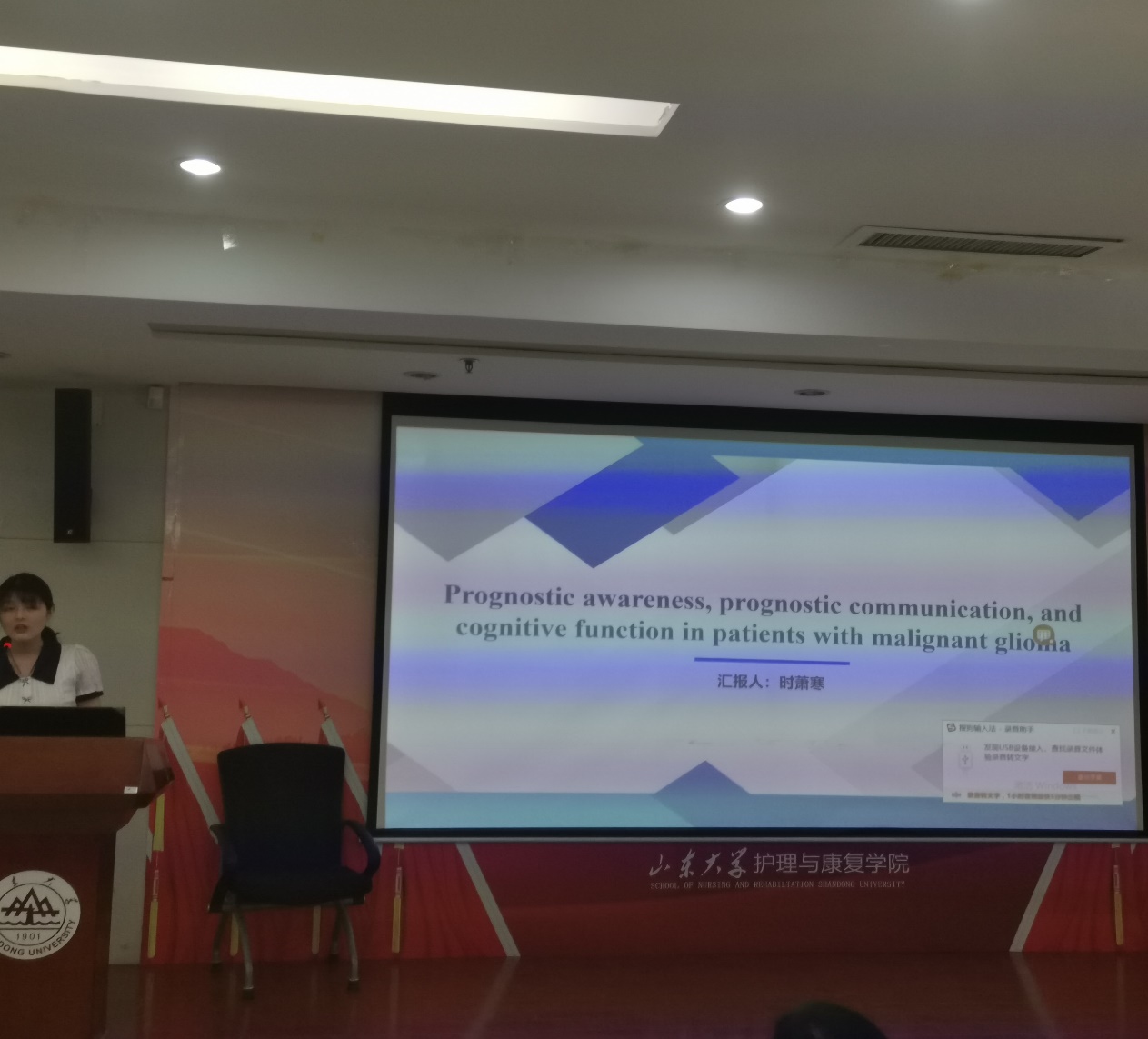 最后一位汇报者时萧寒汇报的题目是《Prognostic awareness, prognostic communication, and cognitive function in patients with malignant glioma》。该文章是一个前瞻性研究,研究人员对50例恶性胶质瘤患者和32名陪护人员进行探索性研究,采用半结构式访谈评估患者的预后意识,旨在测量他们对恶性胶质瘤不治之症和预期寿命的认识。研究的评估包括关于预后交流偏好的调查(来自预后和治疗认知问卷的项目)、神经认知评估(霍普金斯言语学习测验修订版、线索测验以及对照口语单词联想测验)、情绪量表(医院焦虑抑郁量表)和生活质量量表(脑肿瘤治疗功能评估[FACT-Br])。结果发现大多数恶性胶质瘤患者不知道自己的预期寿命,记忆障碍可能会影响其对预后信息的偏好。该文章引发了同学们的激烈探讨,时萧寒在汇报后对同学们提出的问题逐一回答,加深了同学们对文章的理解和认识。