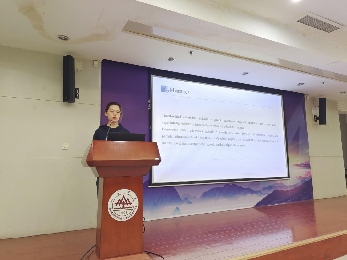 第一位汇报者是2020级硕士研究生乐蕾,本次汇报的是发表在JAMA Network Open上的一篇文章,题为Association of Early-Life Adversity With Measures of Accelerated Biological Aging Among Children in China,该文章发表在Q1区,影响因子为8.483。该研究在中国青少年群体中运用进化发育框架探讨应激与生物衰老的关系,并探讨了基因-环境的交互作用。测量了一些反应青春期发育和生物老化的生理指标,比如乳房发育、端粒磨损。应激被分为两类:威胁和剥夺。结果提示应激(尤其是威胁)与加速生物老化有关,并且与青春期提前有关的基因调节了二者的关系。启示:1. 加速失效时间模型作为一个参数模型,可以同时计算风险比和时间比。用时间比来量化治疗效果时,具有一定的临床意义。也可用来预测数据“成熟”,比如,预测事件随着时间的推移如何累积;2. 应激的分类;3.未来可以从进化发育的角度探讨应激的影响。