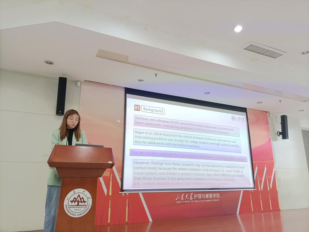 第四位汇报者孙可馨分享的是一篇首都师范大学初等教育学院王美芳老师2020年8月发表在Journal of Affective Disorders的文章,题为“Parental corporal punishment and child anxiety in China: The moderating role of HPA-axis Activity”。该同学详细介绍了本研究的研究背景和讨论,并对本研究父母体罚和儿童焦虑的关系以及HPA轴活性的调节作用进行了总结。该研究发现,清晨和下午较低的皮质醇水平和平缓的皮质醇日节律的改变会恶化父母体罚和儿童焦虑的关系,这对选择性的干预和治疗儿童焦虑具有非常重要的意义。