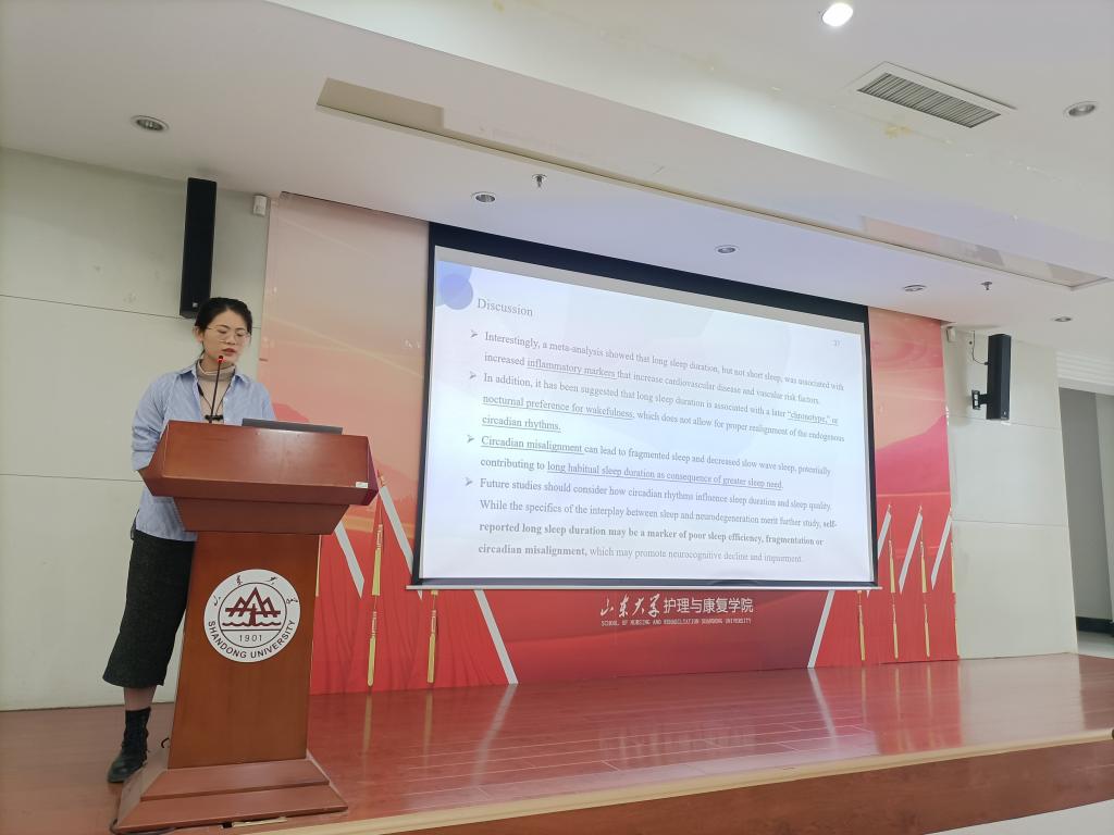第一位汇报者毛芳香同学分享的是于2020年2月Alberto R. Ramos在专业权威杂志Alzheimers Dementia发表的一篇文章,文章题名为“Sleep and neurocognitive decline in the Hispanic Community Health Study/Study of Latinos”。毛芳香同学详细介绍了本研究研究设计和研究结果,并就本研究对目前广泛关注的睡眠问题和认知功能关系进行总结。研究结果表明长时间的睡眠(平均每天超过9小时)会增加神经认知功能下降或损伤的风险,而睡眠呼吸障碍和日间嗜睡与神经认知功能并不相关。毛芳香同学对睡眠时间和认知功能关系的研究现状、关系的潜在机制进行详细的分析和总结,同学们受益颇深。