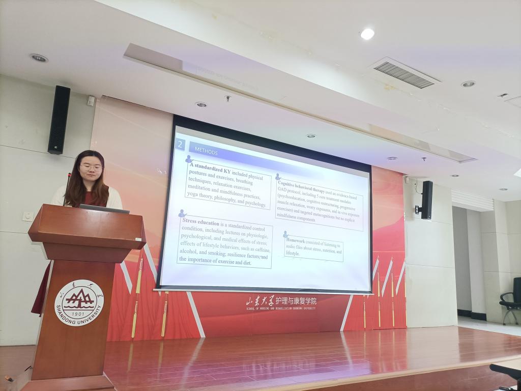 第二位汇报者任敏敏汇报的文献题目为“Efficacy of Yoga vs Cognitive Behavioral Therapy vs Stress Education for the Treatment of Generalized Anxiety Disorder A Randomized Clinical Trial”。本文使用随机对照研究,在多中心比较了瑜伽、认知行为疗法,压力教育治疗广泛性焦虑障碍的疗效。研究采用优势检验和非劣势检验对结局进行了比较,结果显示在治疗后评估及6个月的随访中,认知行为疗法治疗广泛性焦虑障碍的效果优于压力教育;在治疗后评估中,瑜伽治疗广泛性焦虑障碍的效果优于压力教育;在治疗后评估及6个月的随访中,尚未发现瑜伽的疗效不劣于认知行为疗法或认知行为疗法的疗效优于瑜伽。未来的研究应致力于探讨患者倾向于瑜伽的个体特征,促进瑜伽在广泛性焦虑症管理中发挥作用。