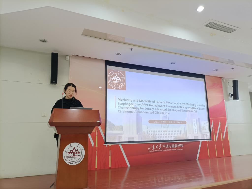 第三位汇报者苏靖雯汇报的文献题目是“局部晚期食管鳞状细胞癌患者接受微创食管切除术前行新辅助放化疗与新辅助化疗之间死亡率与发病率的比较”。本研究是一项在中国十家大型机构进行的随机临床试验。研究纳入264名患者,随机分为两组,分别进行新辅助放化疗与新辅助化疗方案,新辅助治疗期间,新辅助放化疗的患者严重不良反应的发生率较高,但是两组延迟以及减少剂量的发生率比较不具有统计学意义。之后,两组都接受了胸腹腔镜联合的微创食管切除术,但是两者在术后总并发症、严重并发症、术后90天死亡率与术后1年与治疗相关的死亡方面没有发现明显差异。此外,本研究还发现新辅助放化疗方案对鳞癌患者的组织病理学反应方面也有优势。研究提示微创食管切除术前接受基于紫杉醇和顺铂的新辅助放化疗方案对局部晚期食管鳞状细胞癌患者来说似乎是可行、安全和有效的。