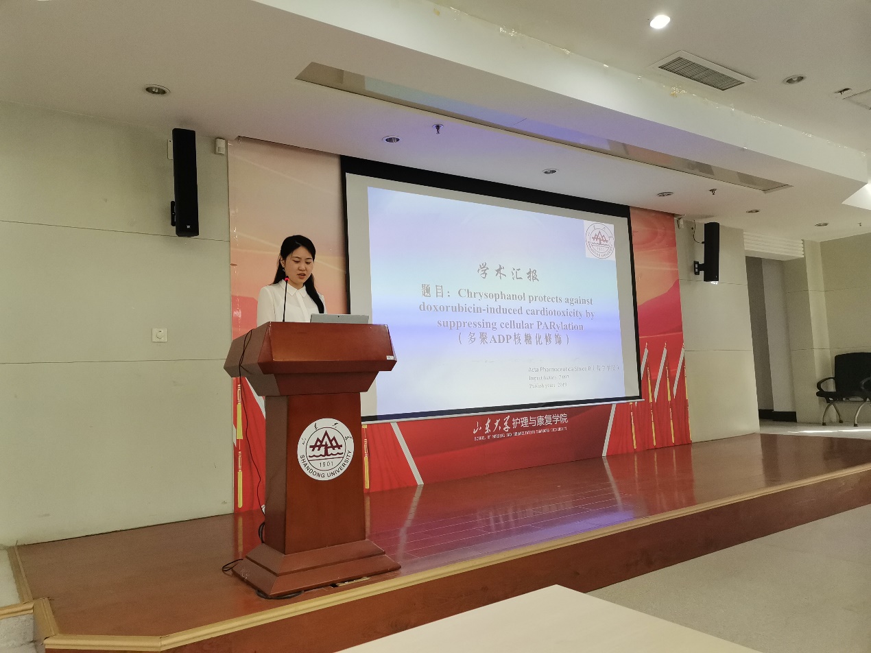 第4位汇报者肖梦杰分享了由Jing Lu等人在2019年发表于Acta Pharmaceutica Sinica B杂志(影响因子:7.097分)的题为“Chrysophanol protects against doxorubicin-induced cardiotoxicity by suppressing cellular PARylation”文章,本篇文章探讨了大黄酚如何通过多聚ADP核糖化修饰改善由阿霉素诱导的心肌毒性,从体内及体外两个部分,证明了大黄酚可以通过抑制多聚ADP核糖化修饰来有效改善阿霉素引起的心肌细胞凋亡及线粒体损伤。病理表观及内在机制描述完整,科研构思清晰,为临床治疗阿霉素引起的心脏毒性提供了一种可行的方法。