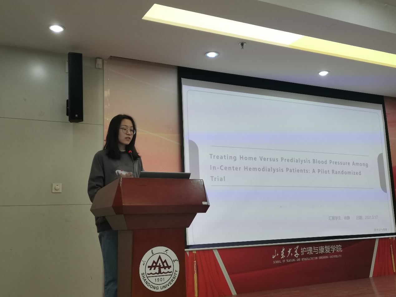 第四位汇报者徐静同学汇报了一篇在血液净化中心透析的患者家庭血压和透析前血压治疗对比的相关研究,是一项为期四个月的非盲平行随机对照研究,来自旧金山和西雅图的50名患者参加按1:1随机分配为家庭血压组和透析前血压组,每隔两周对两个治疗组进行血压的测量和治疗,并对两组进行平行随访,通过两组的对比,来测验家庭血压测量和治疗的可行性、依从性、安全性和耐受性,为透析患者的血压管理提供依据。这项研究表明家庭血压的测量和治疗是可行的和高依从性的,之后需要大规模的研究来测验家庭血压治疗和治疗的长期可行性、有效性和安全性。汇报者表示希望通过这项研究为相关的可行性研究提供启发。在汇报完毕后,并认真回答老师同学们的问题,再次阐述两个治疗组血压测量的方式及频率。