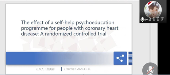 第二位汇报者为2019级专业型研究生类美容,汇报的文献题目为《The effect of a self-help psychoeducation programme for people with coronary heart disease: A randomized controlled trial》,该文章对目前广泛关注的冠心病家庭自助心理教育的理论意义和实际价值做了总结。本研究在基线结果比较时出现了有统计意义的变量--症状控制,后续所有研究结果均为阴性。基于阴性结果,详细解释了阴性结果的可能原因。