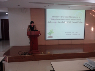 第二位汇报的是2012级研究生田彦,本次汇报的文献题目为Excessive Daytime Sleepiness is Associated With Poor Medication Adherence in Adults With Heart Failure,该篇文章探讨了过度日间嗜睡对心衰患者服药依从性的影响,同时也对认知功能对其关系所产生的作用做了分析。大家就日间嗜睡的定义、日间嗜睡以及认知功能对心衰患者服药依从性的重要性展开了热烈的讨论。田彦同学指出本文中应用的数据分析方法全面透彻,认知功能的测量方法值得以后学习借鉴,对自己有很大的启发。