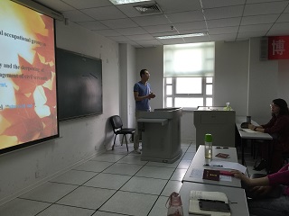 第二位汇报者是2014级学术型研究生孔令华,汇报题目为“Relationship between resilience, stress and burnout among civil servants in Beijing, China: Mediating and moderating effect analysis”,文章采用结构方程和调节效应图分析探讨了公务员的工作压力、心理弹性和职业倦怠之间的中介和调节关系,为今后减轻公务员工作压力和职业倦怠水平提供了新的思路。王克芳老师针对文章中的相关内容和概念进行了热烈讨论,同时对变量间中介和调节作用的区别给出了简明阐述。