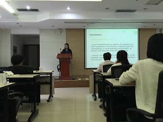 第三位汇报者是2014级专业学位研究生武艳,她汇报的是一篇关于PICC带管患儿并发症的回顾性研究,题为Frequency of Peripherally Inserted Central Catheter Complications in Children。该文献系统阐述了在抗菌治疗的过程中PICC并发症的发生率及与PICC并发症发生率相关的危险因素。王克芳老师就导致并发症高的原因提出了疑问,汇报者给予了详细的解释。