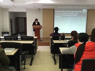 第三位汇报者是13级科硕研究生陈晓云,她汇报的文献题为“Dyadic associations between cancer-related stress and fruit and vegetable consumption among colorectal cancer patients and their family caregivers”。该文章通过探讨结直肠癌症病人及照顾者癌症诊断后一年内蔬菜水果摄入的变化及与癌症相关应激的二元关系,强调了对病人及照顾者共同针对性干预的重要性。陈晓云认为该文章的整体思路清晰,研究设计简单易行,对她今后的研究设计有很大的启发。臧渝梨教授对该文章的相关概念及研究工具提出了疑问,并指出在科研设计的过程中应该明确所有相关概念,同时,她鼓励所有研究生将关注重点放在文章的实用性,能够对临床实践有一定的借鉴意义。