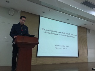 最后回报的是2014级学术型研究生孔令华,汇报的文献题目是“The Association between Meditation Practice and Job Performance: A Cross-Sectional Study”,描述了日本公司员工冥想训练的发生率和人群特征,并采用多元分层回归分析,探讨公司职员冥想训练与工作表现之间的相关性,为今后改善员工工作投入,工作表现以及满意度提高了新的思路和借鉴。厉萍老师和范秀珍老师就冥想训练与正念冥想的差别提出疑问,并对研究方法和回归模型进行了相关讨论。