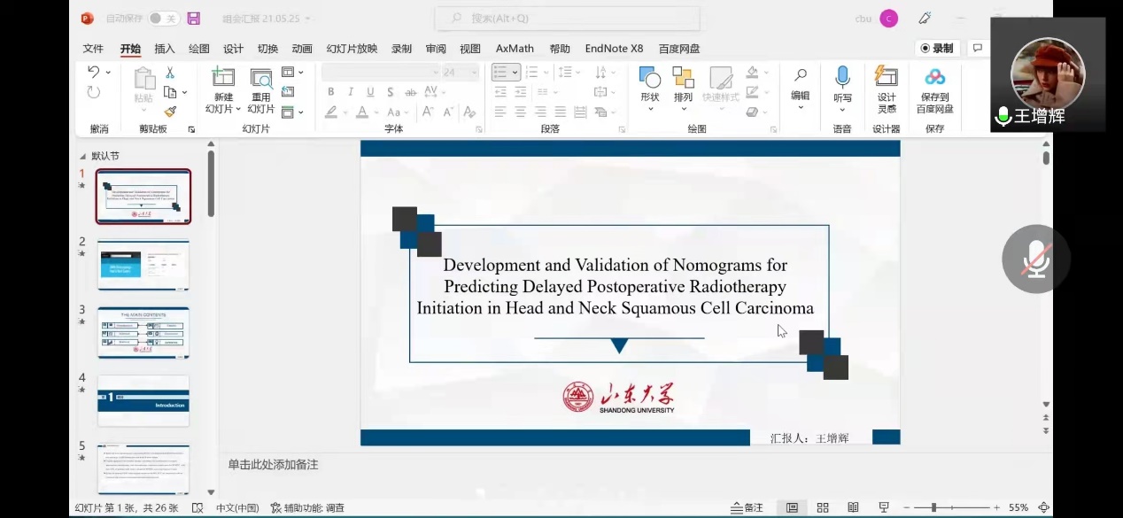第一位汇报者是2020级硕士研究生王增辉,本次汇报的是发表在JAMA Otolaryngology–Head & Neck Surgery杂志上的一篇文章,该杂志2020年的影响因子是5.71,文章的题目是Development and Validation of Nomograms for Predicting Delayed Postoperative Radiotherapy Initiation in Head and Neck Squamous Cell Carcinoma。该研究来自于一项队列研究,使用列线图的方法构建术后放射治疗延迟的预测模型。该文章首先进行了单因素logistic回归,并进一步使用多因素logistic回归进行变量筛选,并在此基础上构建列线图。该研究纳入60766名患有HNSCC的成年人,他们被分为不同的来源和验证军团。衍生队列包括48625例患者(平均年龄59.59(11.3)年;36 825名男性[75.7%])从整个样本中随机抽取,而12151例(平均[SD]年龄59.63[11.2]岁;9266人(76.3%)组成验证队列。在衍生队列中,PORT延迟率为55.8% (n=27140)和56.7% (n=6900)。两个列线图风险预测模型都是为了预测PORT启动延迟使而纳入种族/民族、保险类型、肿瘤部位和设备类型。基于术前变量的列线图包括临床分期和共病的严重程度,而术后变量的列线图包括手术区域、住院时间以及手术和放射治疗设施之间的护理碎片化。术前列线图一致性指数(CI指数)为0.670 (95% CI, 0.664-0.676),验证队列为0.674 (95% CI, 0.662-0.685)。对于术后变量的列线图,衍生队列和验证队列的一致性指数分别为0.691 (95% CI, 0.686-0.696)和0.694 (95% CI, 0.685-0.704)。