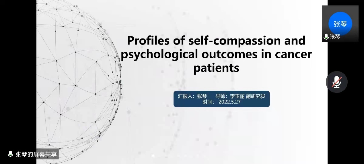 第二位汇报者是2020级硕士研究生张琴,本次汇报的是发表在Psycho-oncology杂志上的一篇文章,该杂志2020年影响因子是3.894,文章的题目是Profiles of self-compassion and psychological outcomes in cancer patients。这是一项在在中国癌症患者中实施的横断面研究,使用了潜在剖面分析的方法探讨了癌症患者自我同情的潜在剖面,并进一步验证了各自我同情潜在剖面的类别特征以及与心理健康结局(焦虑、抑郁)的关系。结果显示癌症患者自我同情存在5个潜在类别:中等自我同情组(54%)、高自我同情组(19.4%)、低自我同情低自我冷漠组(11.4%)、高自我同情高自我冷漠组(11.4%)和中等自我同情高自我冷漠组(7.2%)。总体而言,研究提示要着重关注于年轻人、女性以及有癌症复发的患者,他们的心理同情相对更低。另外中等自我同情高自我冷漠组患者抑郁和焦虑最严重,高自我同情组患者抑郁和焦虑最少。但本研究中仍存在样本量过少、癌症患者异质性大等局限性,未来的研究仍需继续弥补这些不足。