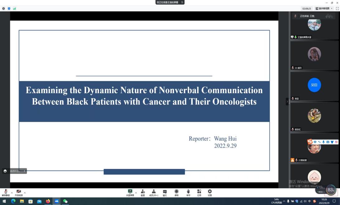 第四位汇报者是2021级博士研究生王慧,汇报的文献题目是“Examining the Dynamic Nature of Nonverbal Communication Between Black Patients with Cancer and Their Oncologists”。该研究使用了基于理论指导的网络分析方法,探讨了黑人癌症患者与其肿瘤医生间的非语言行为的动态特征并识别非语言行为的趋同和趋异效应。通过对黑人肿瘤患者与医生间的癌症治疗讨论进行视频录像,并应用非语言编码系统对视频录像进行编码,构建了3个网络。第一个是时间网络,用于确定某个时间点的非语言行为对下个时间点非语言行为的影响;第二个是同期网络,用于确定在同一个时间点内非语言行为的共同发生情况;第三个是二元间网络,用于确定在整个互动过程中二元间非语言行为的共变性。结果发现,无论是在同期网络,时间网络还是二元间网络,非语言行为均展现了趋同和趋异效应。其中,当医生更多的与患者进行微笑、眼睛的注视和大笑时,趋同效应更易发生。这也说明,医生在沟通互动过程中,可以更多的使用微笑、眼睛的注视和大笑,从而降低沟通过程中种族的差异问题,从而更好的改善治疗和死亡上的差异。