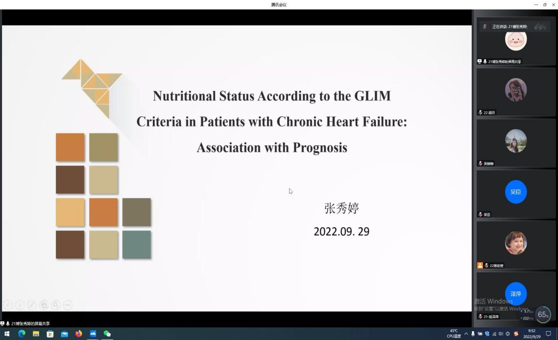 第三位汇报者是2021级博士研究生张秀婷,汇报的文献题目是“Nutritional Status According to the GLIM Criteria in Patients with Chronic Heart Failure: Association with Prognosis”。该项研究主要探讨了根据营养不良全球领导倡议标准(The Global Leadership Initiative on Malnutrition, GLIM)所评估的营养状态与慢性心衰患者预后的相关性问题。主要研究目的包括:在门诊心衰患者中检验GLIM工具所评估的营养状态的预后预测能力;将GLIM工具与先前已经验证的营养状态评估工具,即简易营养评估量表(Mini Nutritional Assessment, MNA)进行比较,观察两者对预后预测能力的差异。该研究是对一项前瞻性观察队列的事后分析,队列共包含了151名门诊心衰患者。在基线时,所有患者均完成了通过MNA量表所进行的营养筛查和状态评估。在事后分析时,作者又根据GLIM标准评估了基线时患者的营养状态。队列随访时间为五年,主要结局为全因死亡率,次要结局为心血管死亡和复发性心衰相关入院。研究结果发现,根据GLIM标准,有19.8%的患者被判定为营养状态异常,而根据MNA标准,有25.1%的患者被判定为营养状态异常。在多变量分析(控制了年龄、性别、心功能分级、糖尿病和躯体残疾)中发现,由MNA而非GLIM标准评估的营养状态是心衰患者五年全因死亡率、心血管死亡率以及复发性心衰相关住院的独立预测因素。研究表明,在门诊心衰患者中,相较于GLIM标准,MNA标准对预后具有更好的预测能力,可以作为常规营养评估工具使用。