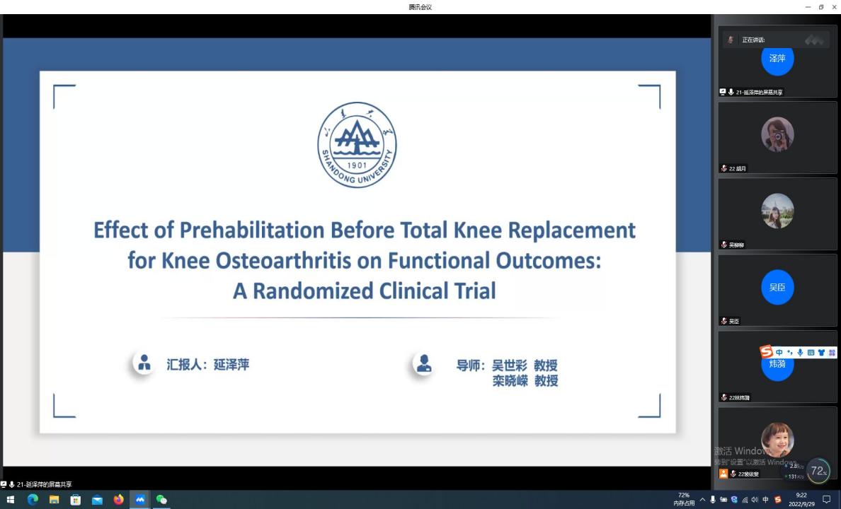 第二位汇报者是2021级博士研究生延泽萍,本次汇报文章的题目是“Effect of Prehabilitation Before Total Knee Replacement for Knee Osteoarthritis on Functional Outcomes:A Randomized Clinical Trial”,该文章发表在JAMA Network Open杂志,2021年影响因子是13.353。这是一项在膝骨关节炎患者人群中实施的前瞻性、双臂平行随机对照试验,旨在探讨对患者全膝关节置换术之前接受多学科的预康复是否能够改善患者的术后的康复结局。对干预组实施4次多学科的康复训练和健康教育,每次干预的时间为90分钟(30分钟的健康教育和60分钟康复训练),对照组实施常规护理。本研究最终纳入262例患者,干预组和对照组各131例。结果显示,并没有足够的证据表明,在膝骨关节炎患者接受全膝关节置换术前对其进行多学科预康复可改善短期功能独立性或减少术后中期活动限制。但本研究仍存在失访率高、依从性不足等局限性,未来的研究可通过质性研究进一步解决这些局限性。