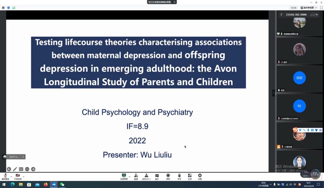 第一位汇报者是2021级博士研究生吴柳柳,汇报的是Child Psychology and Psychiatry 杂志上的题为“Testing lifecourse theories characterising associations between maternal depression and offspring depression in emerging adulthood:the Avon Longitudinal Study of Parents and Children”的文献。该篇研究采用结构化生命历程模型检验了累积风险、敏感期、不稳定性三个理论模型,以探讨母亲抑郁对子代成年早期抑郁的影响,并阐述了性别的差异。该文献的分析方法和写作风格值得护理研究人员借鉴与学习,研究结果对未来干预的实施具有指导意义。