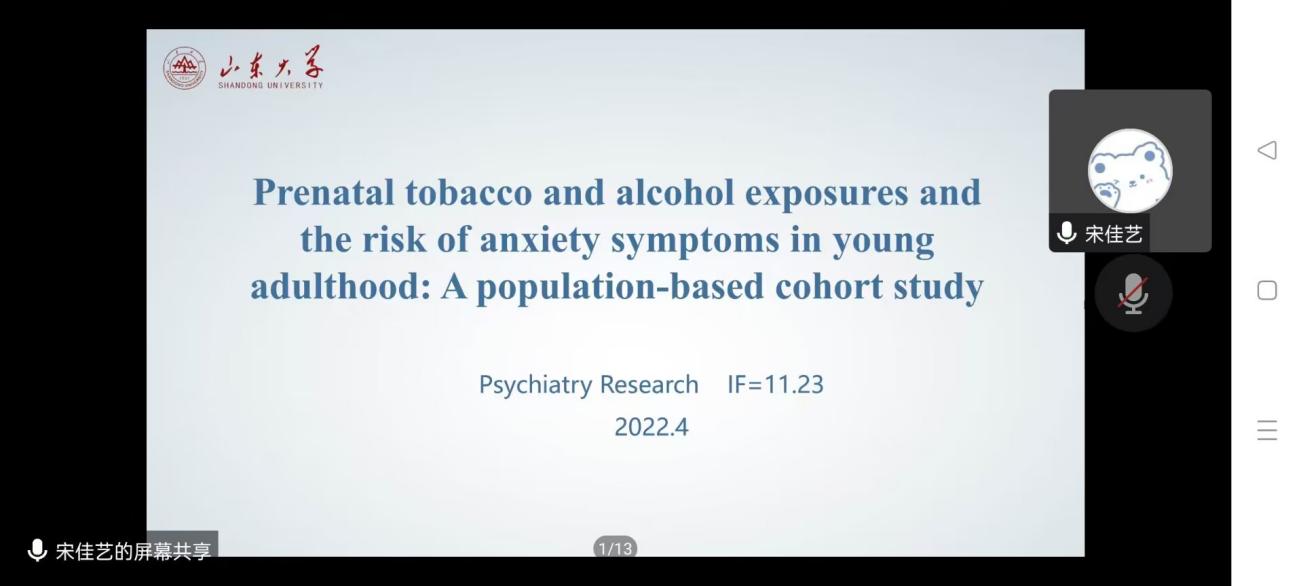 第四位汇报者是2021级硕士研究生宋佳艺,汇报的文章来自Psychiatry Research期刊,题目为“Prenatal tobacco and alcohol exposures and the risk of anxiety symptoms in young adulthood: A population-based cohort study”。这项基于人群且具有较大样本量的队列研究调查了孕早期和孕晚期女性烟草和酒精暴露,并在分娩后对母亲和孩子进行20年的随访。在数据分析部分,很好地区分了混杂变量和中介变量,通过建立多个模型探究混杂因素和中介因素的作用,这种分析方法值得借鉴。结果表明,烟草暴露的孕妇和酒精暴露的孕妇在家庭人均年收入、教育程度、子代在16岁时母亲的焦虑程度上有明显不同,在排除混杂因素和中介因素对结果的影响之后,产前烟草暴露与子代经历焦虑症状间的关联依旧是稳定的。