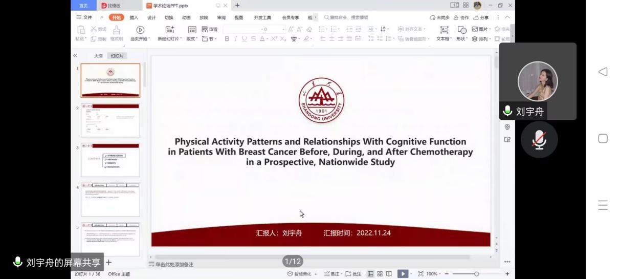 第一位汇报者是2021级硕士研究生刘宇舟,汇报文章的题目为“Physical Activity Patterns and Relationships With Cognitive Function in Patients With Breast Cancer Before, During, and After Chemotherapy in a Prospective, Nationwide Study”。癌症相关的认知能力下降(CRCD)是一个重要的临床问题。这项研究在NCORP网络内的大型全国纵向样本中进行,使用了多种经过充分验证的主客观认知功能测量方法,用年龄匹配对照,以控制衰老效应,调查了接受化疗的患者与年龄性别匹配的无癌对照组相比,身体活动(PA)的模式与认知功能的关系。从PA的时间、强度、变化等方面去探讨PA与认知改善的关系,贴合临床后续的干预窗口和剂量问题。研究结果表明,从化疗前到化疗后维持较高的中到高强度体力活动(MVPA)水平,或至少在治疗前满足国家PA指南,可能有助于缓解CRCD。
