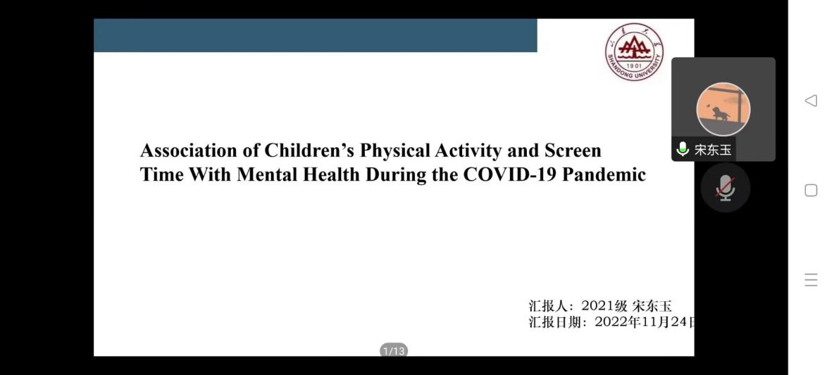 第三位汇报者是2021级硕士研究生宋东玉,本次汇报的是2021年发表在JAMA Network Open杂志上的一篇文章,文章题目是“Association of Children’s Physical Activity and Screen Time With Mental Health During the COVID-19 Pandemic”。这是疫情期间针对美国儿童青少年进行的一项研究,研究目的是探索COVID-19大流行期间,美国儿童青少年身体活动和屏幕使用时长与心理健康的关系。此外,研究还试图了解这些健康行为是如何受到儿童暴露于COVID-19大流行相关压力源的影响的。采用横断面设计,对具有全国代表性的500例6-10岁儿童父母以及500对11-17岁青少年和父母组进行调查。结果显示更多的身体活动和更少的屏幕使用时长与儿童青少年更好的心理健康结果相关。在疫情之前,美国有3/4的儿童青少年没有达到体育活动准则,这种情况因疫情而加剧。倡导增加身体活动和减少屏幕使用时长是改善儿童青少年心理健康的有效措施。