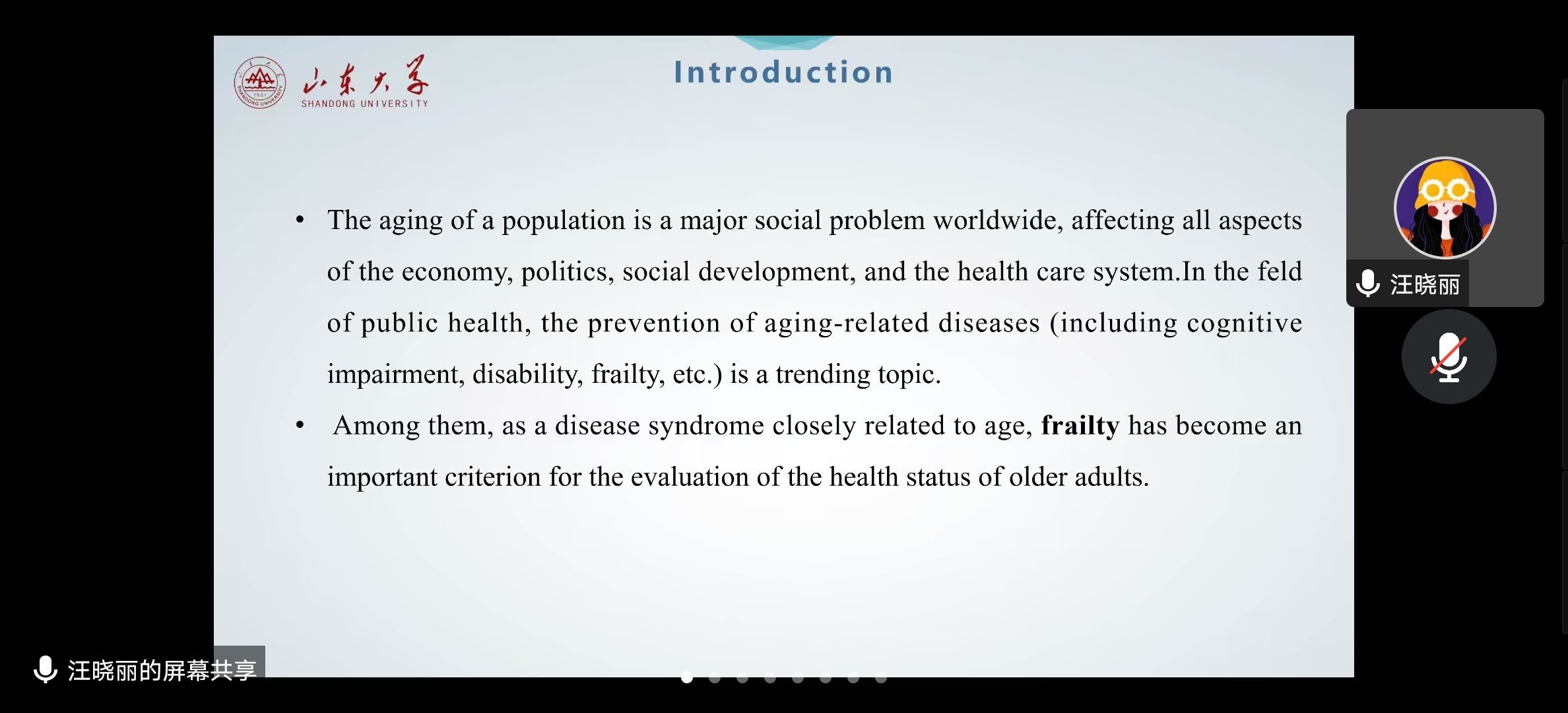 第二位汇报者是2021级硕士研究生汪晓丽,汇报的文章来自于BMC Geriatrics上的“Association between social capital and frailty and the mediating effect of health-promoting lifestyles in Chinese older adults: a cross sectional study”。这项研究于2021年5月,在长沙市对674名中国老年人进行了一项横断面研究。数据收集采用中国缩短社会资本量表(包括结构性社会资本和认知社会资本作为两个分量表),这是促进健康的生活方式概况和蒂尔堡衰弱指标的简化版本。采用线性回归分析来检验社会资本与衰弱之间的关系。采用结构方程模型检验促进健康生活方式的中介作用。结果表明,认知社会资本与衰弱及其三个维度(生理、心理和社会衰弱)呈显著负相关,而结构性社会资本则与之无关。促进健康的生活方式在认知社会资本与衰弱、身体和心理衰弱之间的联系中起了中介作用,但与社会衰弱无关。较高的认知社会资本与衰弱的可能性降低有关。促进健康的生活方式部分地介导了认知、社会资本和衰弱之间的联系。使用促进健康的生活方式或适当的认知社会资本干预措施可能会减少老年人的衰弱。