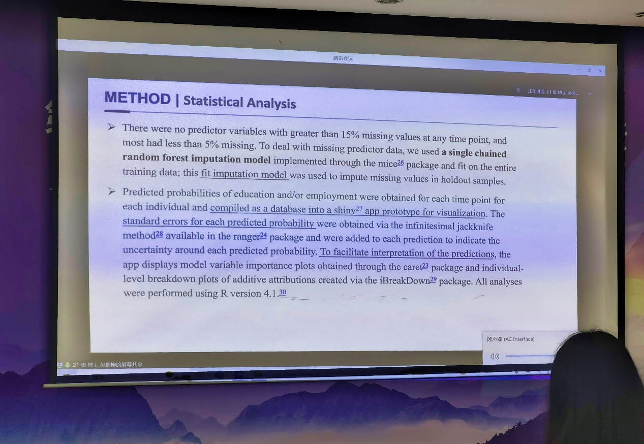 第一位汇报者是2021级博士研究生吴柳柳,汇报的文章于2022年发表在JAMA Psychiatry杂志上,题为“Prediction Tool for Individual Outcome Prediction Tool for Individual Outcome Trajectories Across the Next Year in First-Episode Psychosis in Coordinated Specialty Care”。该研究借用学习型卫生保健系统中的OnTrackNY项目,在第一次精神病发作的患者中,使用了基线数据和从基线起每3个月随访至第24个月的数据,通过机器学习和可视化、动态化的轨迹去预测未来一年内不同时间点的教育/工作的参与和因精神疾病而住院的频率,结果显示该工具对未来一年内不同时间点的教育/工作参与的预测性能较好。这项研究表明,可以为首次发作精神病患者的结局开发准确的预测工具,这可能会为共同的临床医生决策提供信息。