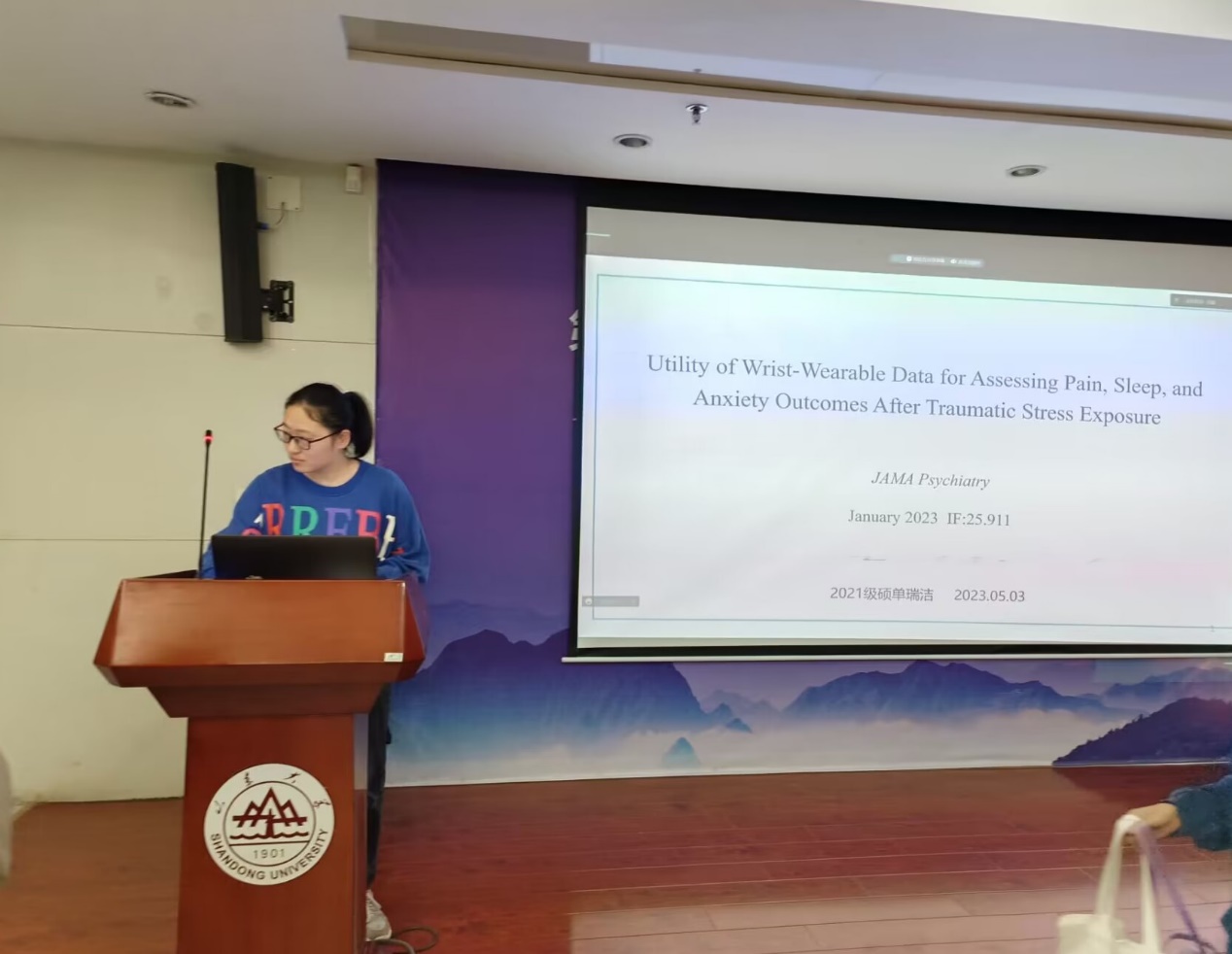 第一位汇报者是2021级硕士研究生单瑞洁,汇报的文章来自JAMA Psychiatry,题为Utility of Wrist-Wearable Data for Assessing Pain, Sleep, and Anxiety Outcomes After Traumatic Stress Exposure。该研究试图找出和创伤后不良的神经精神后遗症(adverse posttraumatic neuropsychiatric sequelae, APNS)存在关联的休息-活动特征,该特征从内置加速度计的腕部可穿戴式设备得出。将数据随机分为推导数据集和验证数据集,先在推导数据集里使用双变量线性混合模型,错误发现率FDR校正识别出和症状存在“个体间”关联和“个体内”关联的休息-活动特征。这些通过了推导步骤的关联会在验证数据集中验证,同样使用双变量线性混合模型,使用更为严格地Bonferroni校正最终确定和相应症状存在关联的腕表式特征。最后对于通过验证步骤的特征和症状进行重新二分类,评估了特征值增加或减少对症状评分增加或减少的敏感性、特异性和阳性预测值。研究结果表明这种常见的腕戴式设备可能有助于筛查在某个时间点上有高疼痛水平的创伤幸存者或随着时间疼痛、睡眠和/或焦虑恢复不佳的创伤幸存者。该研究将腕表式的设备引入临床情景中,探讨了它是否可以作为一种临床工具来帮助筛查APNS症状,先后使用了不同的校正方法,考虑到了不同校正方法的优缺点,值得借鉴。