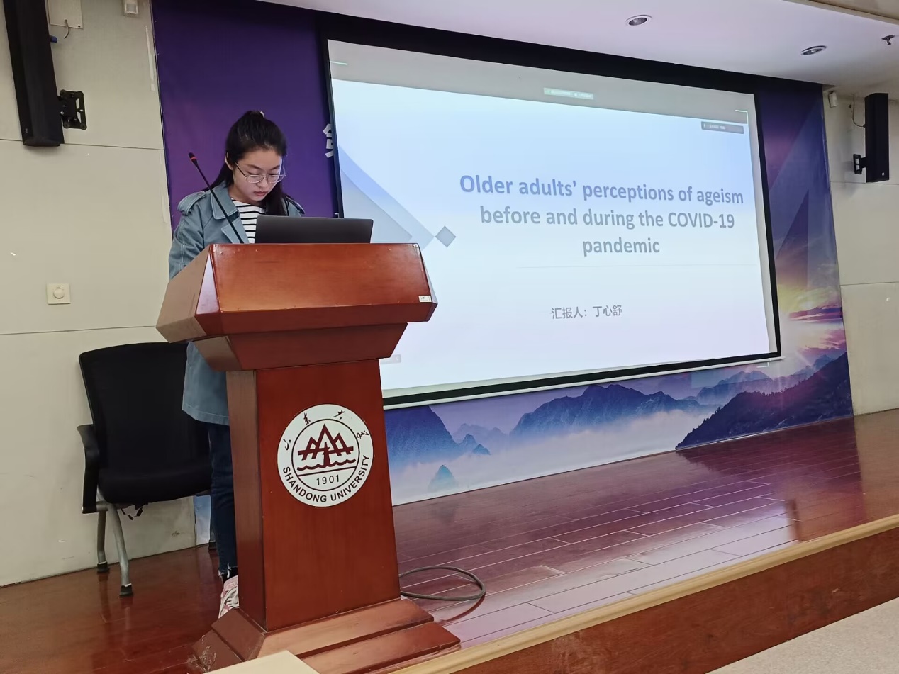 第四位汇报者是2021级硕士研究生丁心舒,汇报的文章来自Aging & Ment Health,题目为Older adults’ perceptions of ageism before and during the COVID-19 pandemic。本研究利用纵向数据评估新冠大流行期间以及新冠大流行前对年龄歧视的感知,以探究大流行期间的年龄歧视和老化衡量标准的变量(身体衰退、社会损失、持续增长和主观年龄的感知)在多大程度上可以预测了老年人自我感知的心理和身体健康。迄今为止,还没有对大流行前与大流行期间影响的潜在混淆进行检验,本研究是对大流行时代结果的稳健性测试是一种有意义的扩展和澄清。