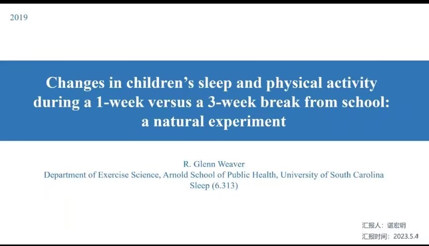 第二位汇报者是2021级硕士研究生谌宏玥,汇报的文章来源于Sleep,题为Changes in children’s sleep and physical activity during a 1-week versus a 3-week break from school: a natural experiment。该研究采用了自然实验设计,探讨放假一周和三周儿童的睡眠和运动在假期间改变的组间差异,以及从上学日到放假期间儿童睡眠和运动的个体内变化,这为未来研究在非结构化日(如周末、放假)有针对性的制定儿童肥胖的干预措施提供了理论依据。基于“结构日假说”,即认为在结构日(如上学日、工作日),儿童倾向于进行较少的增肥行为(长时间久坐和屏幕暴露、较少的活动量以及睡眠模式的改变)。该研究发现,与放假一周的儿童相比,放假三周的儿童在工作日有更长时间的久坐行为和更少的活动时长;而放假一周和三周儿童的睡眠差异无统计学意义;这提示运动模式的改变可能在放假三周后才有所体现,而睡眠的改变可能与放假时长无关。另外,与上学日相比,放假期间儿童的入睡时间、起床时间和睡眠中点延迟,每天活动时长减少、久坐时长增加。最后,该研究把儿童每天处于不同活动水平的时长进行每小时求和平均后发现,在上学日的放学后,儿童的活动时长与放假期间同时段的活动时长类似;这提示未来研究应关注放学后和假期中儿童的增肥行为。