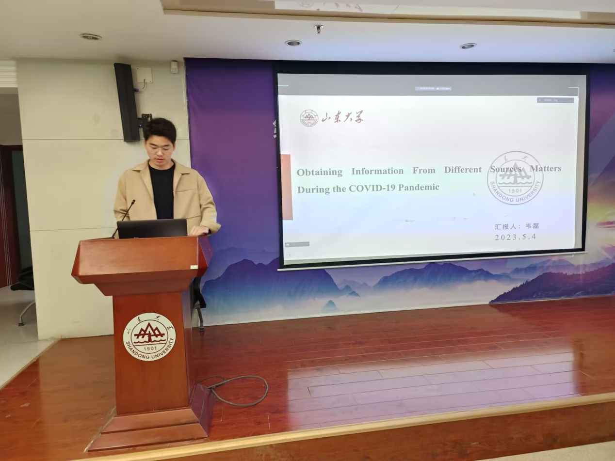 第三汇报者是2021级硕士研究生韦磊,汇报的文献题目为Obtaining Information From Different Sources Matters During the COVID-19 Pandemic。该文章报告了在新冠疫情大流行期间年轻人和老年人在信息搜寻模式上的差异,并探讨这种信息来源数量上的差异对个体在大流行时期信息担忧以及实施健康保护行为的影响。结果表明,在新冠疫情大流行期间,老年人比年轻人从更多的渠道获取信息,并且具有更高的信息担忧水平以及从事更多的健康保护行为。究其原因可能是老年人认为新冠相关的信息与其生命健康更加相关且更有意义,但仍需要进一步的研究来验证这一发现是否可以推广到大流行以外的环境中。除此之外,本研究还提出了一个能够打击错误信息并促进个体实施健康保护行为的相对简单和有效的方式,即扩大个体的信息来源选择。