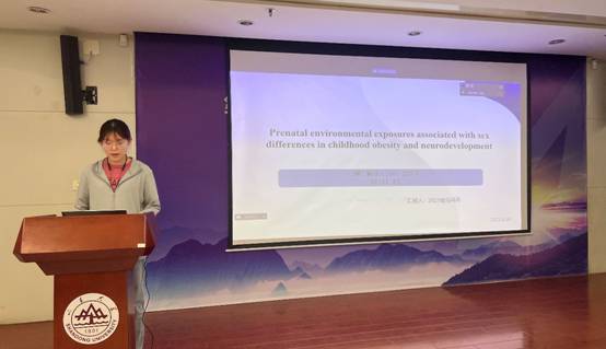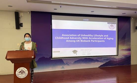 第四位汇报者是2021级硕士研究生肖意苹,汇报的文章为来自于JAMA network open期刊,题目为 “Association of Unhealthy Lifestyle and Childhood Adversity With Acceleration of Aging Among UK Biobank Participants”。本研究利用英国生物银行的数据,引入了一种新型的评价衰老方式的方法—表观年龄加速,通过9种临床生物标记物与实际年龄进行计算。该研究分析了儿童期逆境与表观年龄加速的独立作用与累积作用,并探讨不健康的生活方式在这种关系之间的中介作用。本研究使用了广义线性模型分析儿童期逆境与表型年龄加速的关系,并按性别和实际年龄分层以验证结果的稳健性。研究结果显示,不健康的生活方式部分中介了儿童期逆境与表观年龄加速的关系。这一发现揭示了通过生活方式从童年逆境到成年早期和中期健康的途径,并强调了除了生活方式干预之外心理策略促进健康老龄化的潜力。