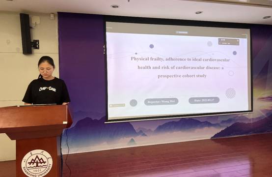 第二位汇报者是2021级硕士研究生王美,汇报的文章题为 “Physical frailty, adherence to ideal cardiovascular health and risk of cardiovascular disease: a prospective cohort study”。该研究主要探讨了躯体衰弱(physical frailty)和理想的心血管疾病健康(ideal cardiovascular health)与心血管疾病风险(risk of cardiovascular disease)之间的关联。主要研究目的包括:在中年人和老年人中检验躯体衰弱前期和衰弱状态与随后的心血管疾病发生风险之间的关联;探讨处于衰弱状态的参与者能否从坚持理想的心血管疾病健康中获益。该研究为一项前瞻性观察队列研究,研究人群来自英国生物样本库,共有314093名参与者被纳入统计分析。躯体衰弱包含体重下降、疲乏、低躯体活动、步速减慢和握力下降五个方面;理想的心血管疾病包含吸烟、躯体活动、饮食、体重、胆固醇、血压和血糖七个方面。主要结局为致命性和非致命性的心血管疾病,包含冠心病、心衰和中风三种亚型。COX比例风险回归结果显示:与非衰弱相比,衰弱前期和衰弱期与心血管疾病发生风险增加有关;与较差的心血管健康水平相比,处于中等和理想的心血管健康水平与心血管疾病发生风险下降有关;衰弱并处于较差的心血管疾病健康水平的参与者心血管疾病的发生风险最高。因此,该研究建议中老年人加强生活方式和代谢管理,同时开展针对衰弱的干预措施以降低心血管疾病的发生风险。