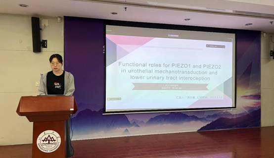 第三位汇报者是2021级硕士研究生饶永娟,汇报的文章为来自于JCI insight期刊,题目为“Functional roles for PIEZO1 and PIEZO2 in urothelial mechanotransduction and lower urinary tract interoception”。内感觉非常重要,它将身体内部功能(如心跳、呼吸、消化和膀胱充盈)的感觉与更高层次的功能联系起来,但是下尿路的机械感觉与内感觉联系起来的机制尚不清楚。为了响应膀胱充盈,尿路上皮释放ATP,据推测ATP将通过膀胱充盈程度传达给传入神经纤维来刺激排尿功能。为了确定PIEZO通道在该过程中是否充当机械传感器,作者生成了尿路上皮特异性Piezo1,Piezo2和双Piezo1 / 2-敲除(KO)小鼠。结果显示PIEZO1通道在所有尿路上皮细胞层中表达,Piezo2表达仅限于浅表伞形细胞的一小部分。在监测排尿行为时,雄性Piezo1-KO小鼠在不活跃的光照期表现为排尿增加,雄性Piezo2-KO小鼠在活跃的黑暗期表现出尿失禁(即尿液渗漏)。双Piezo1 / 2-KO小鼠的表型改变最为明显,尿路上皮对机械刺激的反应降低,ATP释放减少,麻醉的Piezo1 / 2-KO雌性小鼠膀胱活动减退,雄性和雌性Piezo1 / 2-KO小鼠在活跃的黑暗期中表现为尿失禁。这些结果表明,尿路上皮以性别和昼夜节律依赖性的方式发挥作用,将尿路上皮PIEZO1/2通道驱动的机械转导与正常的排尿功能和行为联系起来,在没有这些信号的情况下,膀胱就会发生功能障碍。