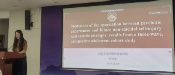 第三位汇报者是2022级硕士研究生于菲萍,汇报的文章为来自于European Child & Adolescent Psychiatry 期刊,题为 “Mediators of the association between psychotic experiences and future non-suicidal self-injury and suicide attempts: results from a three-wave, prospective adolescent cohort study”。这项研究主要探讨了精神病性体验与后续的非自杀性自伤以及自杀尝试之间的关联,以及这一关联的时间关系和潜在原因。