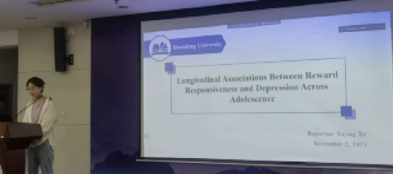第二位汇报者是2022级硕士研究生许雅静,汇报的文章来自于Journal of the American Academy of Child & Adolescent Psychiatry期刊,题为“Longitudinal associations between reward responsiveness and depression across adolescence”。抑郁发生率在青少年早期急剧增加并在整个青少年期持续增长,且青少年有寻求奖赏行为增加的特征。目前有大量的横断面研究考察了奖赏反应性和抑郁症状之间的关系,发现二者有负相关关系,也有纵向研究考察了奖赏反应性对抑郁的预测作用,然而尚未有研究在青春期多个时间点探究奖赏反应性和抑郁的双向关系。该研究采用结构方程模型在青少年9岁、12岁和15岁时分别测量了奖赏反应性的神经指标RewP和抑郁症状,考察二者的双向关系,同时控制了性别和青春期发育状态这两个关键的发育指标。结果发现在12岁和15岁的奖赏反应性和抑郁症状上有双向前瞻性预测关系,提示奖赏反应性可能是抑郁的易感因素或者结果。该研究带给我们关于纵向研究数据分析、多主体报告以降低测量误差以及写作严谨性的启示。