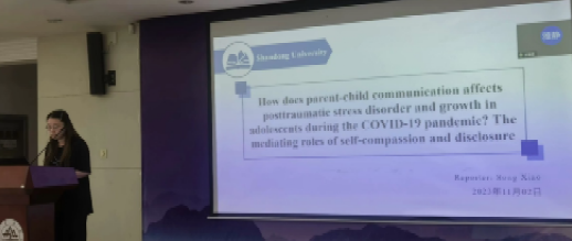 第五位汇报者是2022级硕士研究生宋逍,汇报的文章为来自于Journal of affective disorders期刊,题为 “How does parent-child communication affects posttraumatic stress disorder and growth in adolescents during the COVID-19 pandemic? The mediating roles of self-compassion and disclosure”。这项研究主要探讨了亲子沟通与创伤后成长及创伤后应激障碍间的相关关系,同时探讨了自我同情与自我披露在其中的中介作用。
