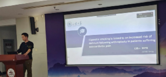 第一位汇报者是2022级硕士研究生徐子恒,汇报的文章来自CNS neuroscience & therapeutics期刊,题目为“Cigarette smoking is linked to an increased risk of delirium following arthroplasty in patients suffering from osteoarthritic pain”。文章主要讲述吸烟会增加骨关节炎疼痛患者全膝关节置换术后谵妄的风险。谵妄是由感染、药物毒性和代谢异常等多种应激源引起的一种衰弱性神经心理障碍,可导致大脑的急性应激反应。疼痛是骨关节炎患者最常见的症状,也是进行关节置换手术主要的原因,疼痛与谵妄机制类似,在短时间内急剧诱导儿茶酚胺释放并产生促炎交感神经反应。皮质醇系统的功能障碍和炎性细胞因子的慢性过度表达可能受到慢性疼痛的影响。因此,急性或慢性疼痛可能增加谵妄发生的机会。在慢性疼痛患者中吸烟现象很普遍,吸烟与疼痛之间呈现恶性循环,尽管短期少量的尼古丁刺激会改善认知功能,但长期吸烟导致乙酰胆碱减少以及多巴胺水平增加,会增加谵妄发生的风险。