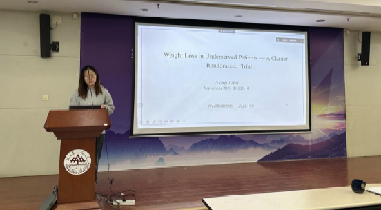 第三位汇报者是2022级硕士研究生陈恺悦,本次汇报的文章发表在The New England Journal of Medicine杂志上,文章题目为“Weight Loss in Underserved Patients—A Cluster-Randomized Trial”。本文研究目的是探讨在服务不足人群(低收入,教育水平受限制)实施密集化生活方式干预与常规护理相比是否可以达到更明显体重减轻的效果。研究结果显示,高强度的密集化生活方式干预使绝大多数患者减轻原有体重5%的重量,且干预效益维持到了第24个月,并伴有部分生活质量测量指标的升高。因此可以采用密集化生活方式干预来解决服务不足人群的肥胖问题,提高健康水平,降低肥胖相关性疾病的发生率(如2型糖尿病、高血压、心血管疾病),具有很大的现实意义。