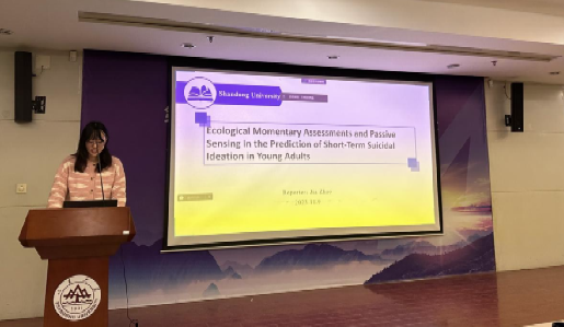 第一位汇报者是2022级硕士研究生赵佳,汇报的文章为来自于JAMA NETWORK OPEN期刊,题为“在年轻成年人中使用生态瞬时评估和被动传感器预测短期自杀意念”。本研究针对急诊科患者展开为期8周的纵向预后研究,要求研究对象完成一天四次的生态瞬时评估,并佩戴腕式传感器(Fitbit Charge 3)。研究的主要目的是使用机器学习算法最优化第二天自杀意念的预测,研究发现仅纳入EMA预测特征的模型拟合最佳,且预测精度最高,而基于传感器的特征模型拟合较差。此外,前一天的自杀意念可以预测后一天的自杀意念。出现这样结果的原因可能是限于技术的发展,传感器的测量精度较低,且自杀意念是使用问卷由参与者主观报告得到的,所以传感器测量到的指标不能精确地预测主观报告的结果。这篇文章对预测特征进行了不同时间尺度的处理,有助于了解这些风险因素的形成过程,值得我们学习。