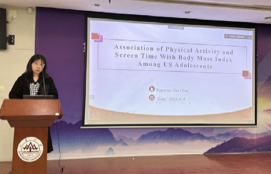 第四位汇报者是2022级硕士研究生陈燕,汇报的文章来自于JAMA Pediatrics,题为“Association of Physical Activity and Screen Time With Body Mass Index Among US Adolescents”。这项研究利用美国最大的青少年脑认知发展长期纵向研究中的5797名青少年样本的横截面数据,对体力活动、屏幕时间与BMI及超重或肥胖的相关性,以及二者交互作用与BMI及超重或肥胖的相关性进行分析。体力活动和屏幕时间均被分成连续变量和分类变量两种数据类型进行细致地研究。结果表明每天屏幕使用时间低于4小时和每天步数超过12000步的组合有利于将BMI百分比升高的风险降至最低,并且屏幕时间类别、步数类别与BMI存在显著的交互作用,具体表现为高水平屏幕时间对BMI的负面影响不能被高水平步数抵消,低水平步数对BMI的负面影响也不能被低水平屏幕时间抵消。这项横断面研究为屏幕时间、步数与BMI、超重或肥胖的相关性提供了科学证据,也为青少年体力活动和屏幕时间的相关指南提供参考。该研究选题具有现实意义,基于科学依据的数据处理方法值得我们学习借鉴。