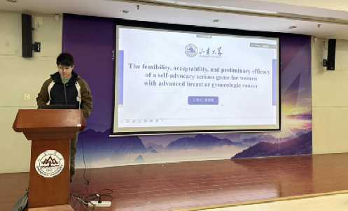第二位汇报者是2022级硕士研究生赵建鑫,汇报的文章来自于Cancer期刊,题为“The feasibility, acceptability, and preliminary efficacy of a self-advocacy serious game for women with advanced breast or gynecologic cancer”。本文主要是在新诊断为晚期乳腺癌或者妇科肿瘤患者人群中,探讨自我倡权严肃游戏干预的可行性、可接受性以及初步效果。这是一项大型随机对照试验的预试验。本研究共招募了78名参与者,以二比一的比例随机分配到干预组和对照组。干预组使用的是本研究团队开发的严肃游戏strong together,该游戏可以通过叙事游戏的方式传授自我倡权技能。研究结局指标包括可行性、可接受性、自我倡权、症状严重程度和生活质量。结果表明该干预方案具有较高的可行性与可接受性,而且与对照组相比干预组在自我倡权、症状严重程度和生活质量方面有着较为显著的效果。通过阅读本篇文章,我们可以了解到严肃游戏这种干预方案的优势与特色,这种干预方案可以使患者远程参与,且不耽误日常的治疗。这种灵活、新颖的干预形式在国内研究并不多,在国外的医疗领域也是热点话题。未来如果引入我国研究,应当考虑其中的跨文化调试问题。